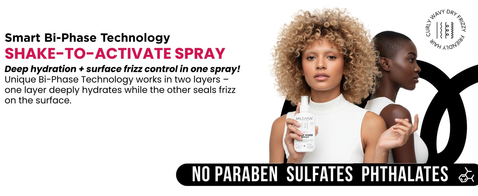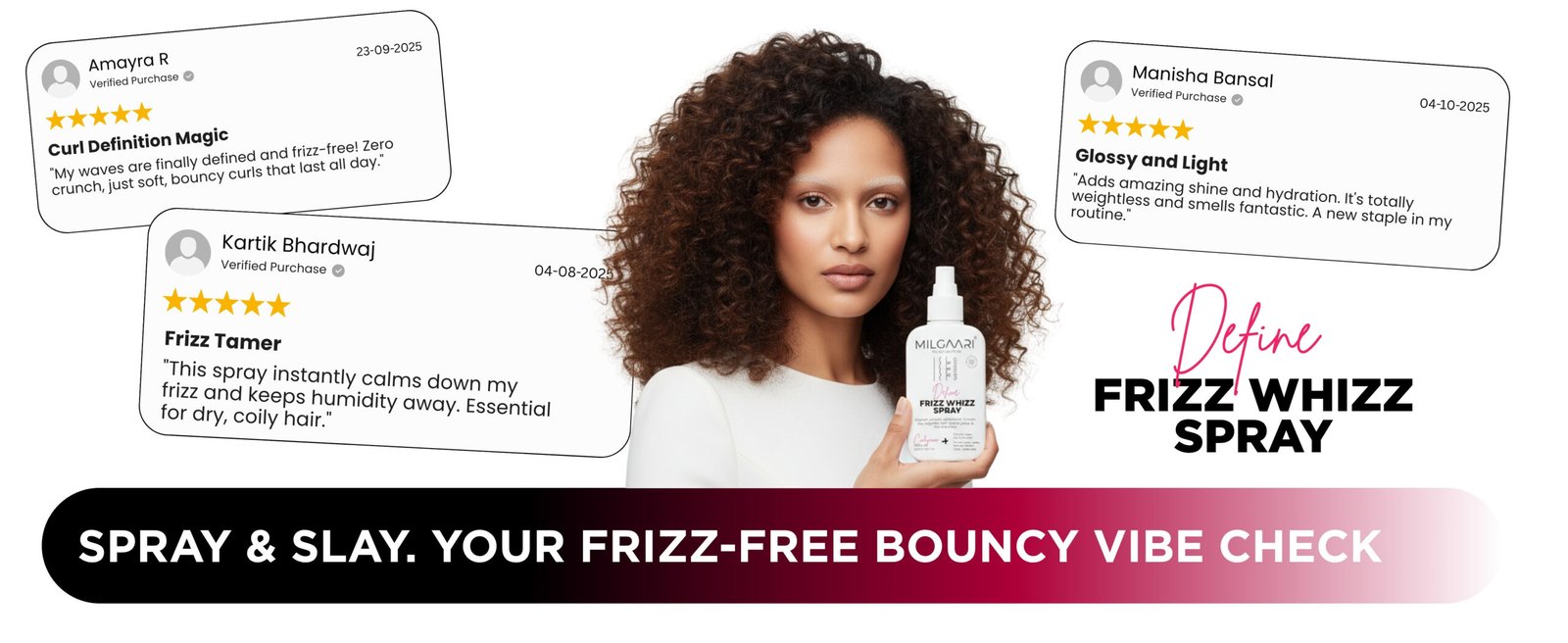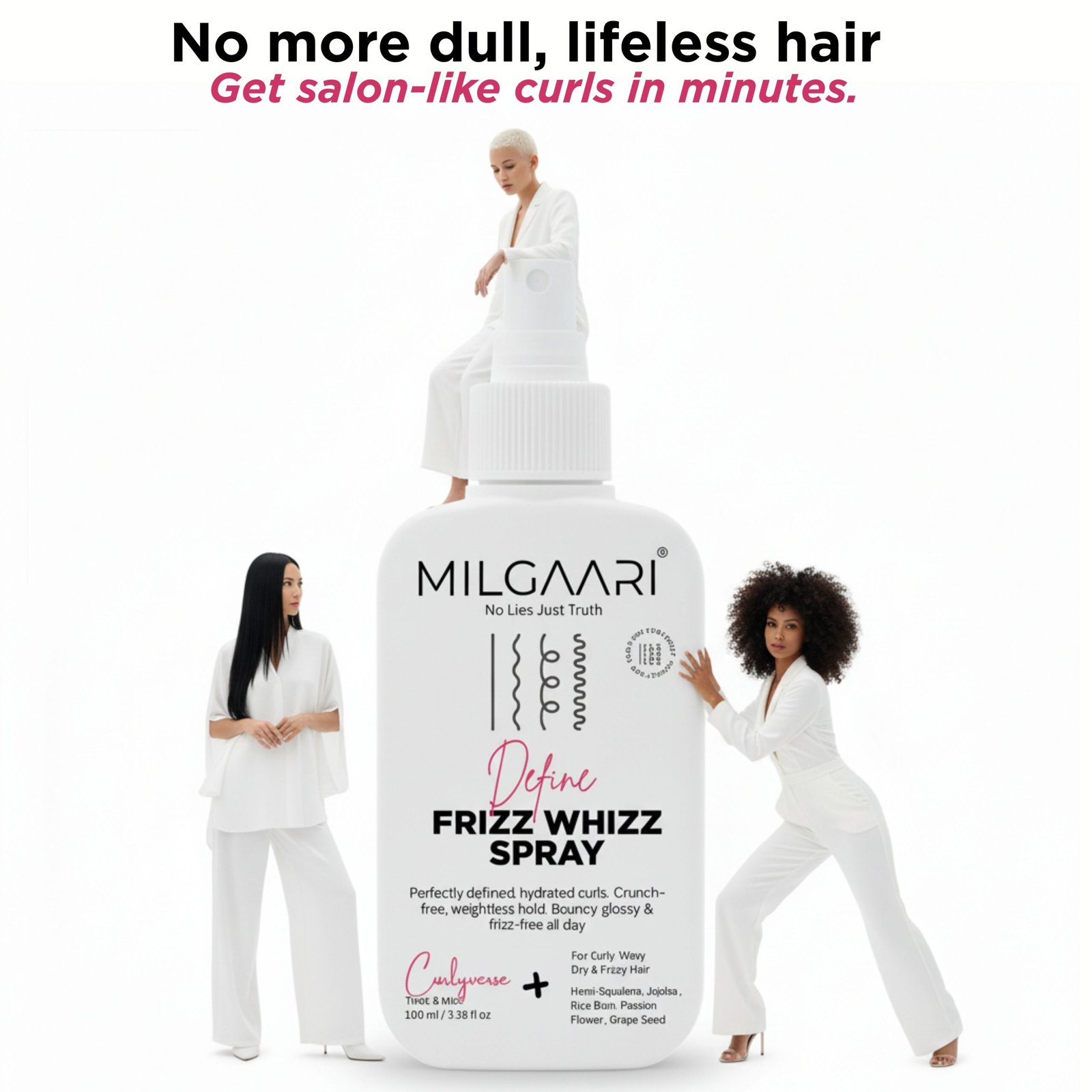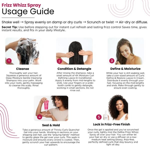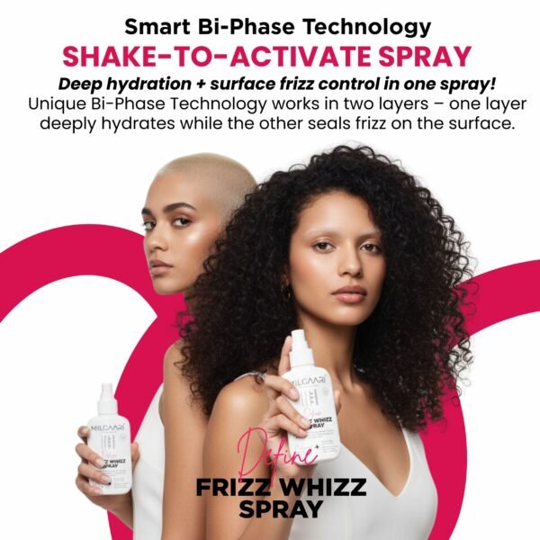 Curl Care ₹299.00 Select options This product has multiple variants. The options may be chosen on the product pageFrizz? We don’t know her! This Frizz Whizz Spray is your Frizz-Free, Bouncy Hydrate Bi-Phase Mist. It’s a lightweight “Twist & Mist” formula that ensures perfectly defined, hydrated curls. Infused with Hemi-Squalene, Jojoba, Rice Bran Extract, Flower, and Grape Seed, it provides a crunch-free, weightless hold, leaving your curls glossy and frizz-free all day.